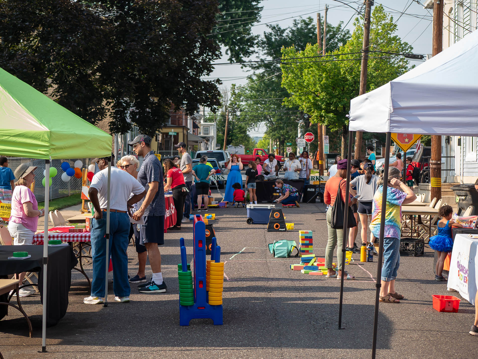 On designated summer evenings, selected blocks are closed to vehicles for two hours and transformed into temporary play zones. In partnership with the Borough of Pottstown Parks and Recreation Department, organizers: